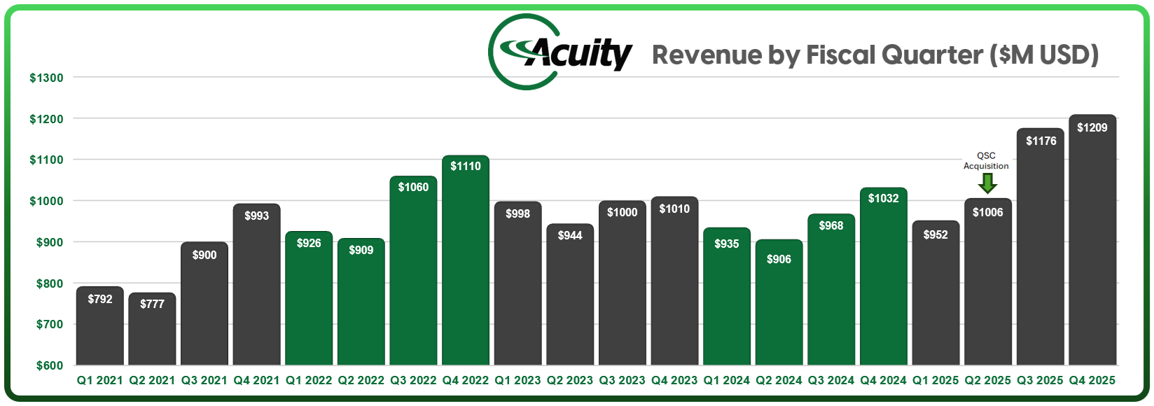 With a strong balance sheet, minimal leverage, and clear strategic priorities, Acuity may not top the percentage-change chart, but many industry observers would argue it remains the strongest business on it. The company will report its next quarterly results in two days, offering another checkpoint in a story defined by consistent strength rather than volatility.