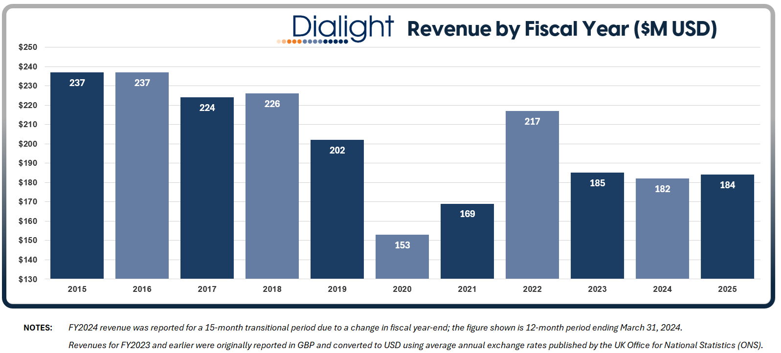 IMPORTANT NOTE: One competing trade publication has, for years, published Dialight’s daily share price inflated by a factor of 100. If the stock trades at £3.40, they report it as £340.00. This has occurred consistently — day after day, year after year — and reflects a fundamental misunderstanding of what they’re reporting. Dialight’s market capitalization is not greater than Acuity’s — not even close — and repeated errors like this are a reminder that reporting the news isn’t the same as understanding it.