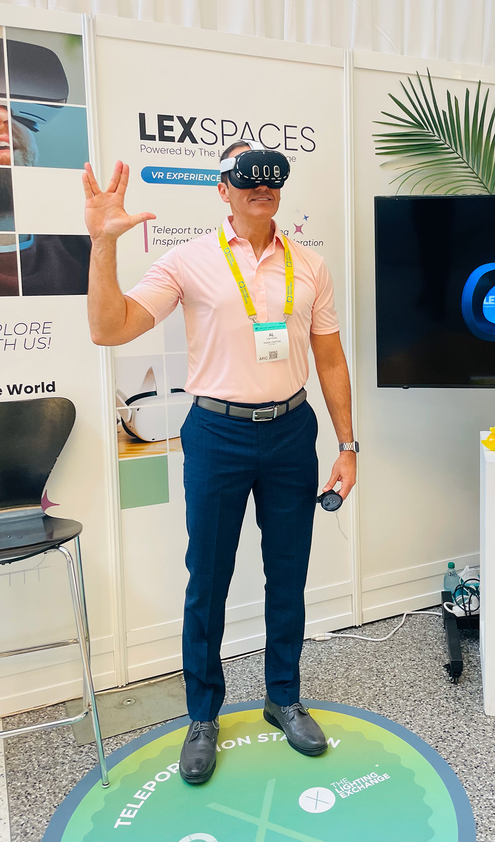 Beam me up: The Lighting Exchange created a virtual reality station that allowed Al Uszynski of Inside Lighting (above) to "teleport" to two architectural lighting projects as if he was on-site.