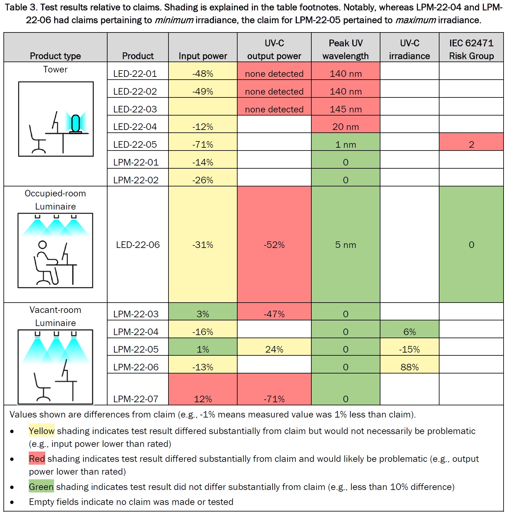 Incomplete or inaccurate performance claims – Performance claims for products were often absent, untestable (e.g., irradiance without stated distance), contradictory (e.g., unexplained differences between multiple power values), or ambiguous (e.g., unclear whether input power or output power). Measurement units frequently conflicted with quantities, making the intended meaning of the claim All five of the consumer-oriented LED tower products claimed to emit UV-C, but three of them emitted none, and the other two mostly emitted UV-A. Eight of the thirteen fixtures tested resulted in at least one test result differing substantially from data claimed by the manufacturer that would likely be problematic.