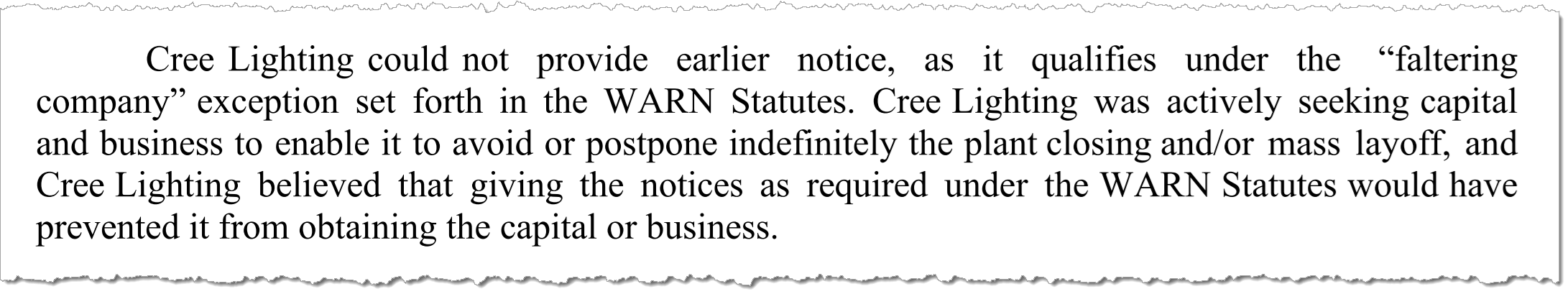Then came the second mechanism. When layoffs were finally announced on March 12, they were immediate. Cree Lighting invoked a narrow WARN exception tied to companies actively seeking capital. The result was the same for workers: no 60-day buffer, no transition period, no gradual landing.