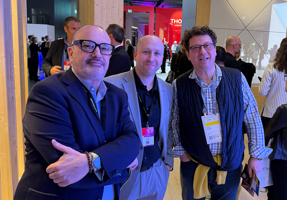 Above: New York lighting designer Attila Uysal (R) of Lumen Architecture visits the Zumtobel booth with company representatives Graham Whittaker (L) and Justin Telesha (middle) at Light + Building 2026.