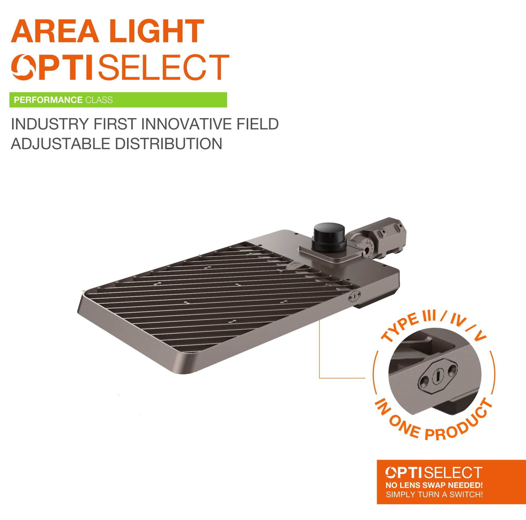 - Field Adjustable Distribution capabilities allow for Type III, IV, and V distributions within a single product without the need for separate lenses.