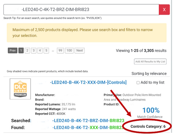 Conceptual example of the Controls Category results when a listed V6.0/LUNA V2.0 product model number is searched for on the SSL QPL.