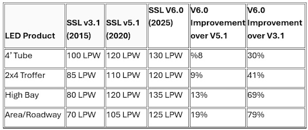 SSL Version 6.0 increases the minimum requirement for LED product efficacy (lumens/W) by an average 14 percent across the board, varying from four percent for some LED replacement lamps to 19 percent for some outdoor product types.