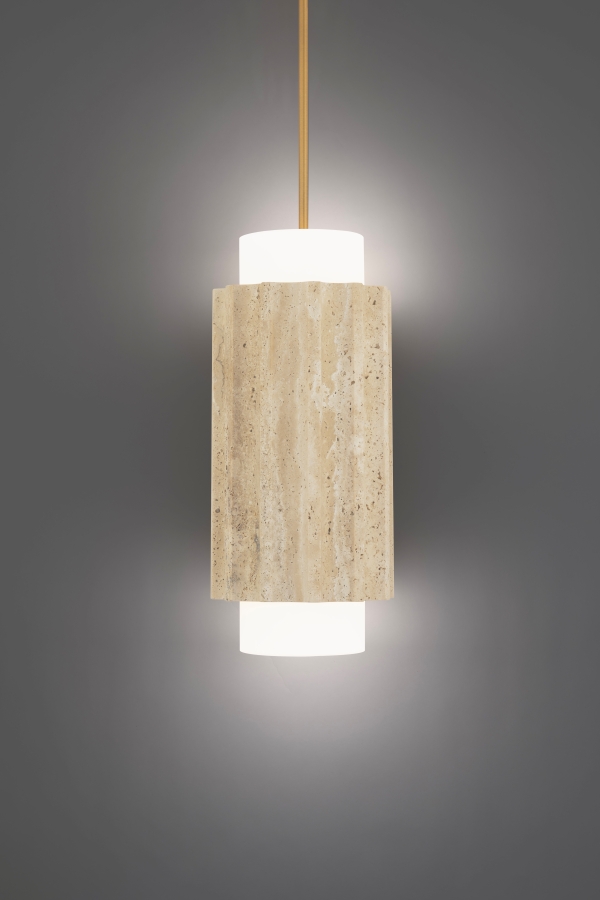 The new Caviar Pendant features travertine and basalt diffusers. Like its namesake, the Caviar pendant is prized for its subtle richness and texture. Its fluted black basalt stone column surrounds an etched opal glass shade, offering a soft, radiant glow delivered by color temperature-adjustable LEDs from the top and bottom. The 16-inch Caviar pendant is available in a beige travertine accented by aged brass or basalt stone complemented by a black finish.