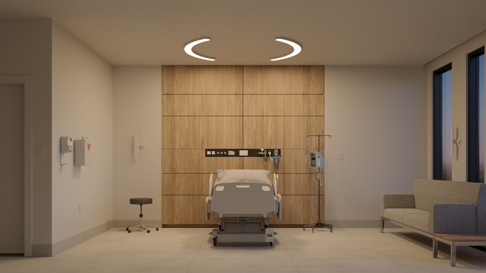 The multifunction patient bed luminaire offers ambient, exam, and night observation modes, with an optional dedicated reading light. Its curved overbed design situates itself in the patient's periphery instead of directly overhead, reducing glare and enveloping the patient in comfortable illumination. At the same time, it meets IES RP-29 suggested light levels for a patient room, ensuring that medical professionals have the necessary illumination to conduct examinations or procedures.