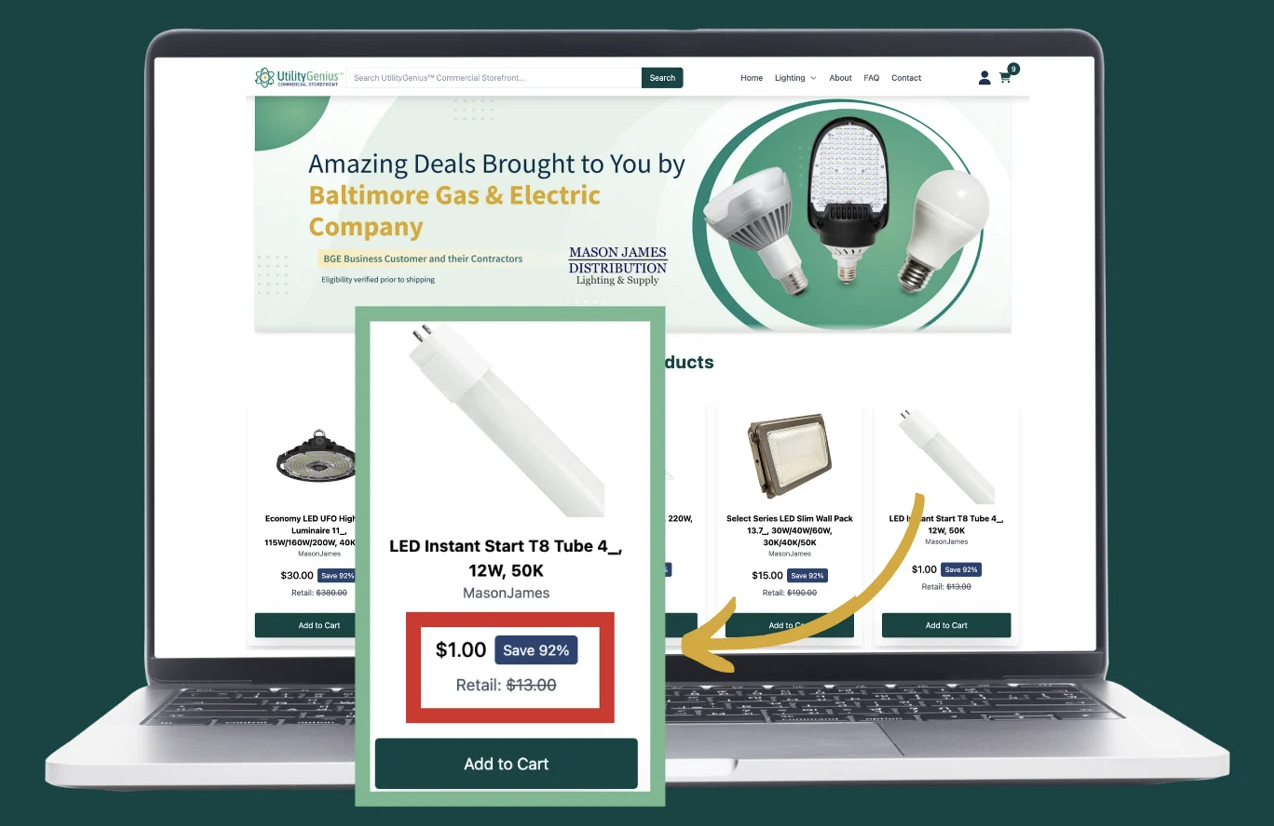 Introducing UtilityGenius Storefront Microsites: Encentiv Energy has built an in-house e-commerce platform that allows for a customizable product catalog as well as tailored branding throughout the site. UtilityGenius Commercial Storefront Microsites can be built for various business models looking to sell rebate-eligible products with instant rebates applied.