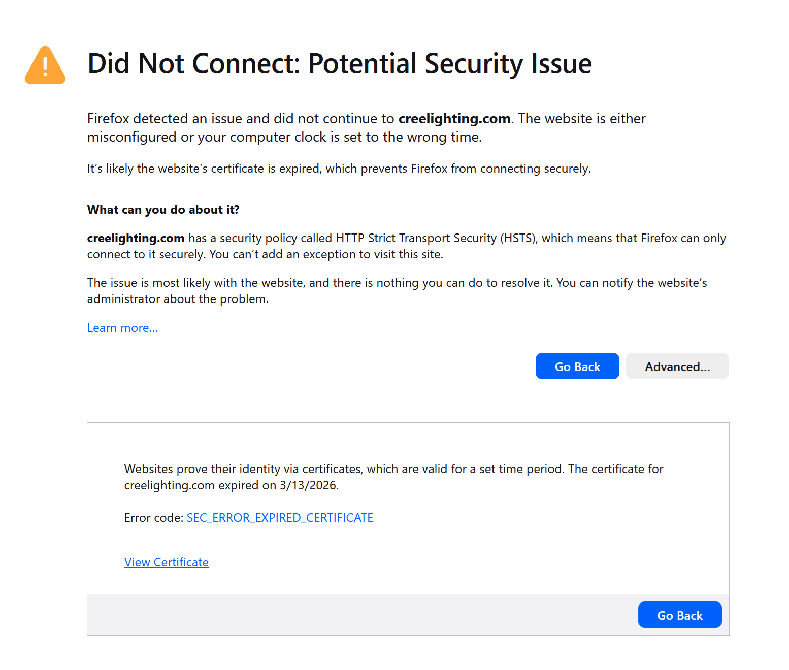 In the world of business websites, things occasionally break. Security certificates expire. Browsers throw up ominous warnings. Usually someone at the company notices quickly and fixes the issue before too many customers see it.