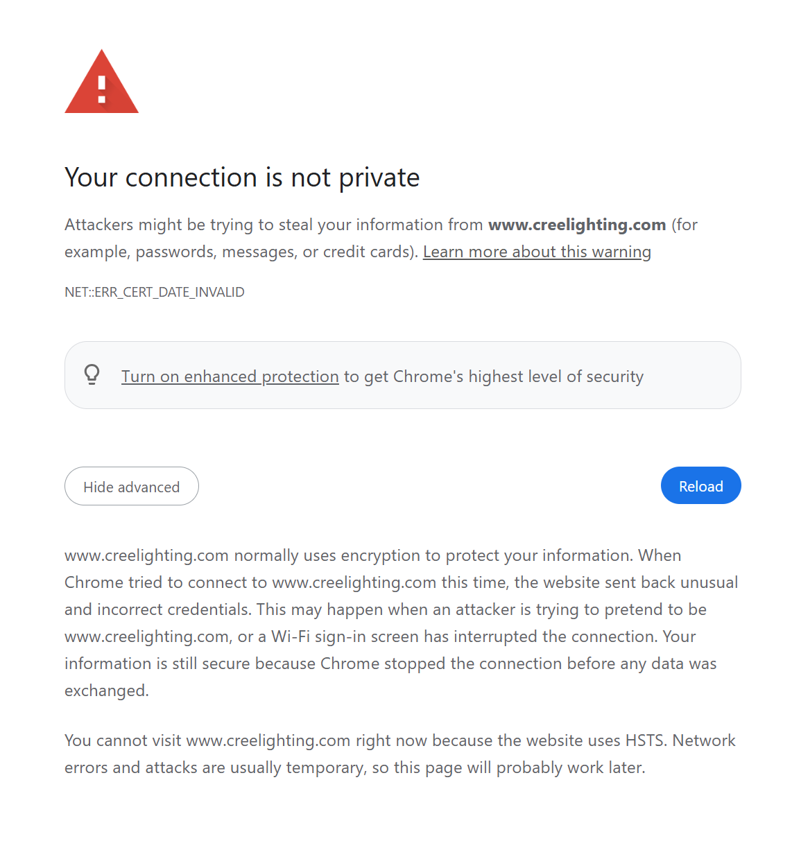 This occurred on Chrome, Edge and Firefox using multiple IP addresses. Modern browsers block access to sites with this kind of security problem, even when the underlying issue is routine. The question isn’t necessarily sabotage. These things happen. But this also happened to five Cree-owned web domains: