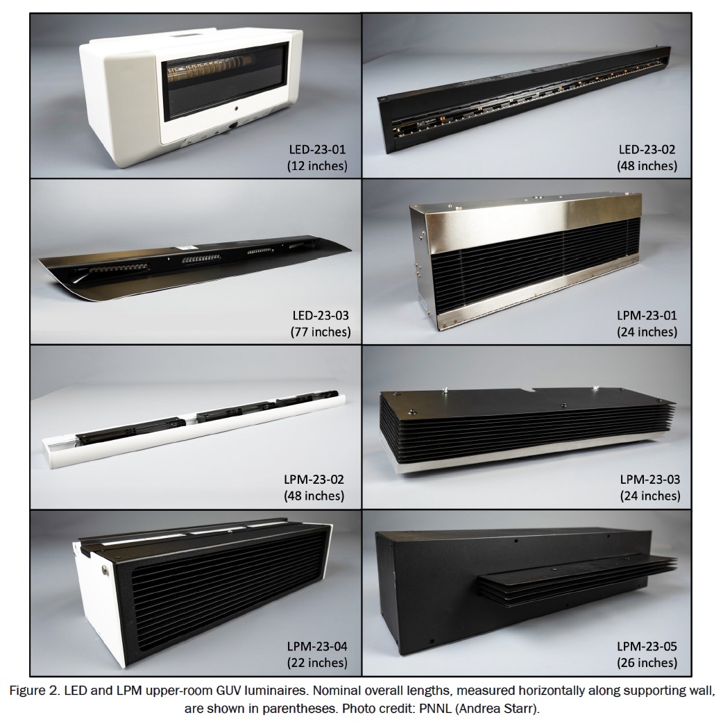 Above: The eight products presented in the "Radiometric Testing of Germicidal UV Products, Round 2: Upper-Room Luminaires" CALiPER report.
