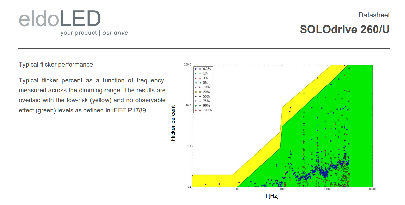 An exception worth noting is eldoLED, part of Acuity Brands. Their SOLOdrive datasheet includes a helpful chart citing flicker behavior across frequency ranges. It’s refreshingly candid, plotting flicker percent across various frequencies. Yet even here, the best data points hover around 700 - 5000 Hz — high for the industry, but still below what some researchers now consider a biologically neutral range.