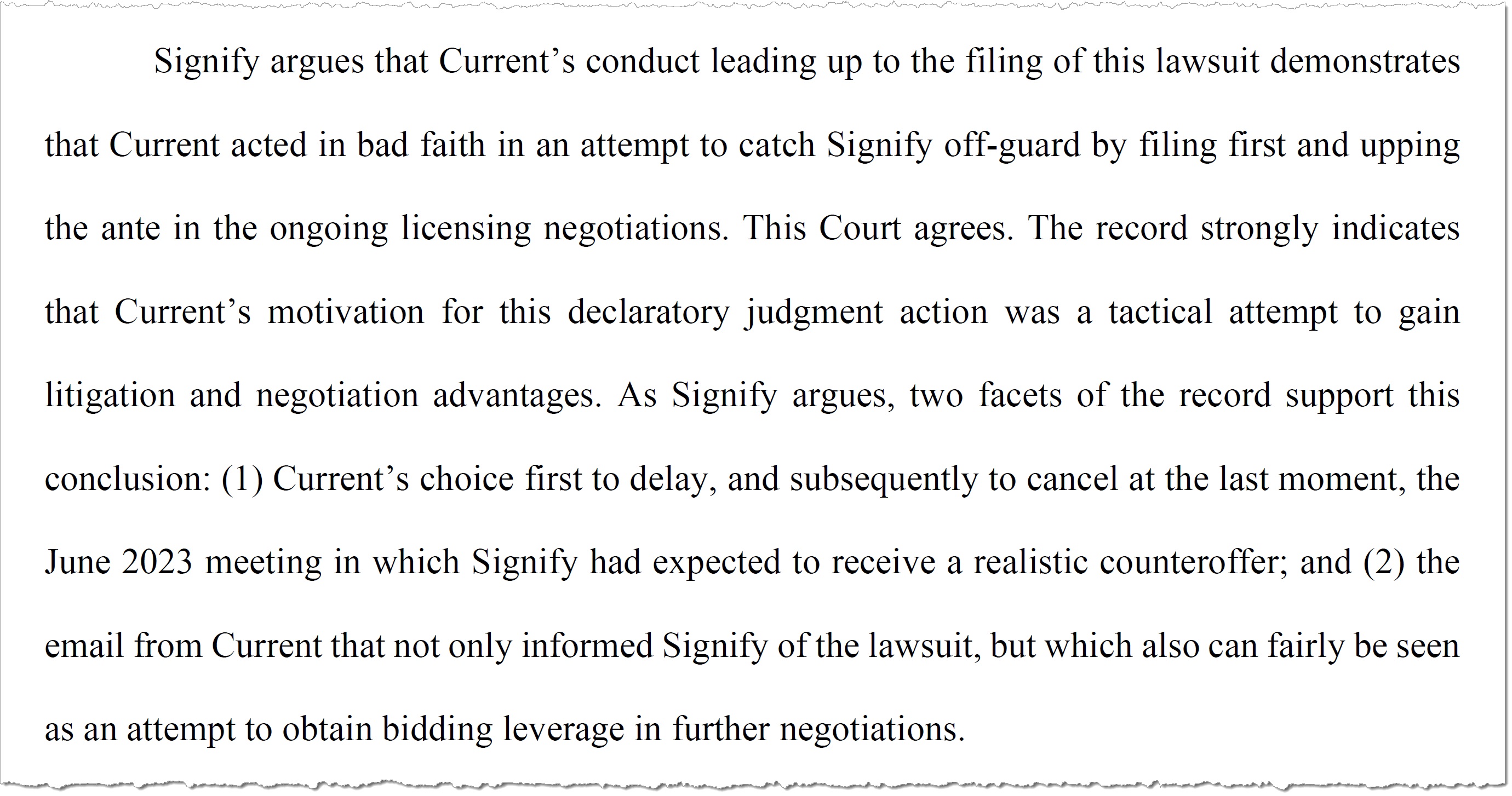Weaken Signify’s Negotiation Leverage: By initiating legal action, Current might have aimed to pressure Signify into coming to the negotiation table with more favorable terms for a licensing agreement, hoping that the threat of a legal battle would make Signify more amenable to compromise.