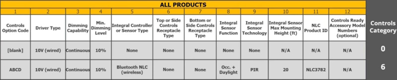 To support this effort, the DLC has introduced a new control options table for each listed product, based on information collected from manufacturers. Each table lists all control variations of an LED product and various control attributes, including driver type, type of dimming and minimum dim level, type of integral controller and/or sensor, receptacle type, integral sensor functionality and maximum mounting height, and the product ID for a compatible DLC-listed networked lighting control system, if applicable. Below is an example: