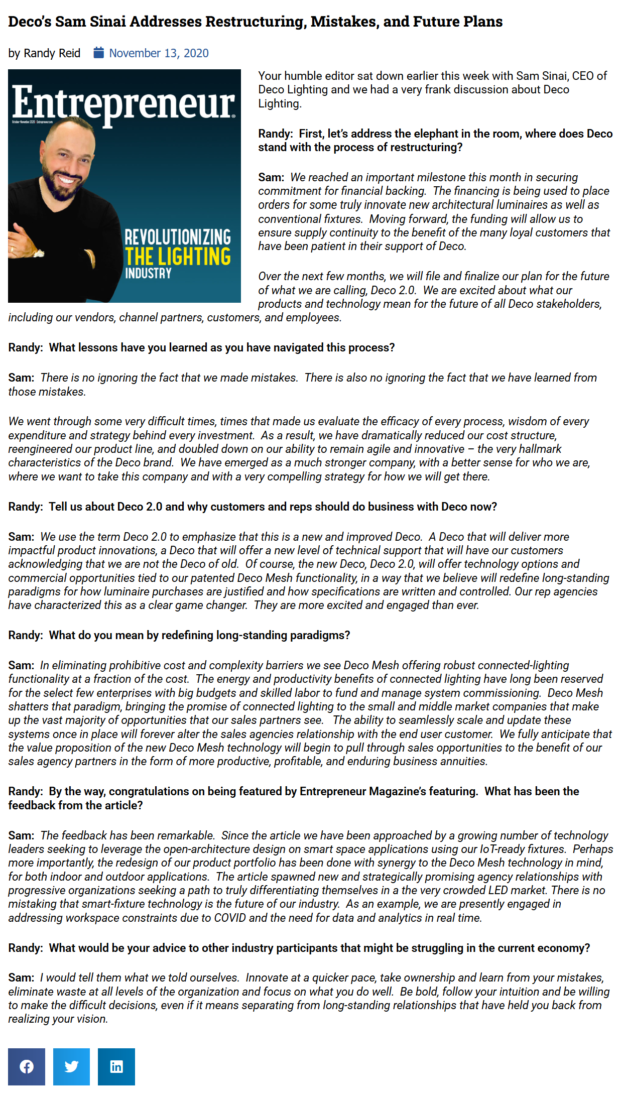 During the bankruptcy period, Deco’s public-facing talking points were amplified through EdisonReport, which regularly published Deco-friendly narratives that largely reflected Deco’s framing without scrutiny. When Deco’s bankruptcy first became known to the industry, an EdisonReport headline news article announced it with the lead sentence: “Deco Lighting is restructuring operations and financial affairs to support its growing wireless technology offering.”  The article made no reference to bankruptcy and later disappeared from the site without explanation.
