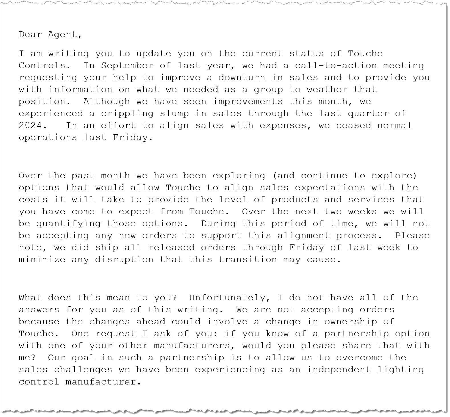 According to multiple former employees, Touché Lighting Controls abruptly terminated most of its workforce on January 24. Employees were reportedly called into a conference room, handed a letter that was not on company letterhead or dated, and told to vacate the premises. One source stated that the messaging attributed much of the company’s financial difficulties to insufficient revenue from independent sales agents.