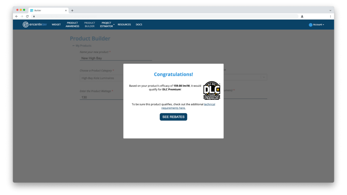With Product Builder you’ll be able to see rebates for a product that is not-yet-listed on the QPL. And you can also see if it will qualify for the DesignLights Consortium® Standard or Premium classification or Energy Star® list.